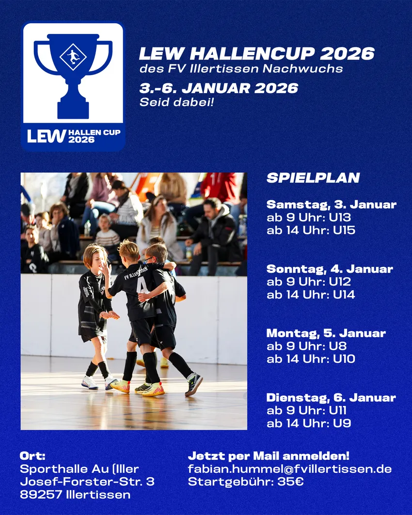 Zum Start ins neue Jahr 2026 laden wir euch herzlich zu unserem Hallenturnier in die Sporthalle nach Au/lller ein. Unser LEW-Cup wird vom 03. bis 06.01.26 wieder viele begeisterte Kinder im Alter zwischen 8 bis 15 Jahren in die Halle locken und tollen Fußball zeigen!